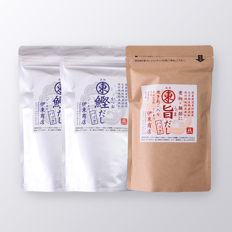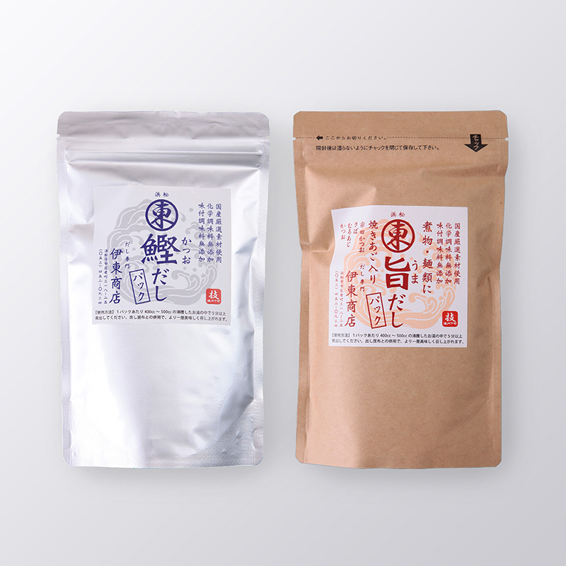 鰹だしパック2個(10g入り×10袋、2袋)、旨だしパック1個(10g入り×10袋)、化粧箱入り2,050円(税込)