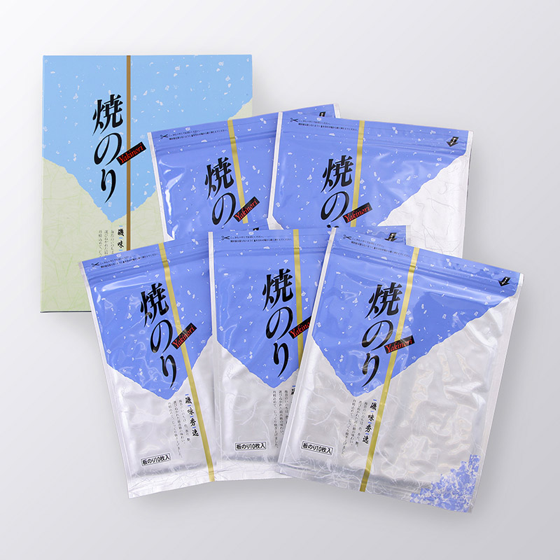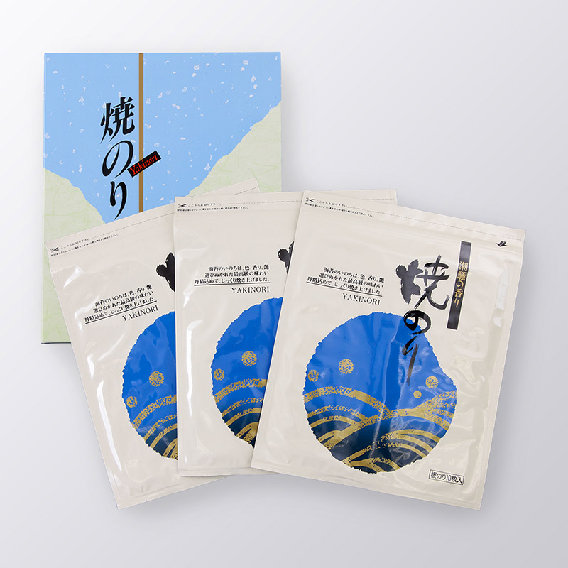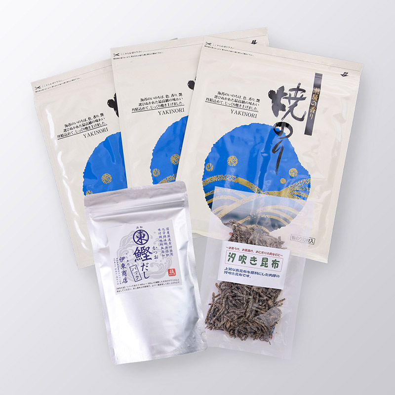 焼海苔(上)10枚入り×3、鰹だしパック1個、汐吹昆布50g入り1袋、化粧箱入り2,500円(税込)