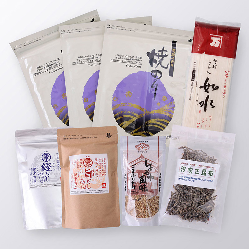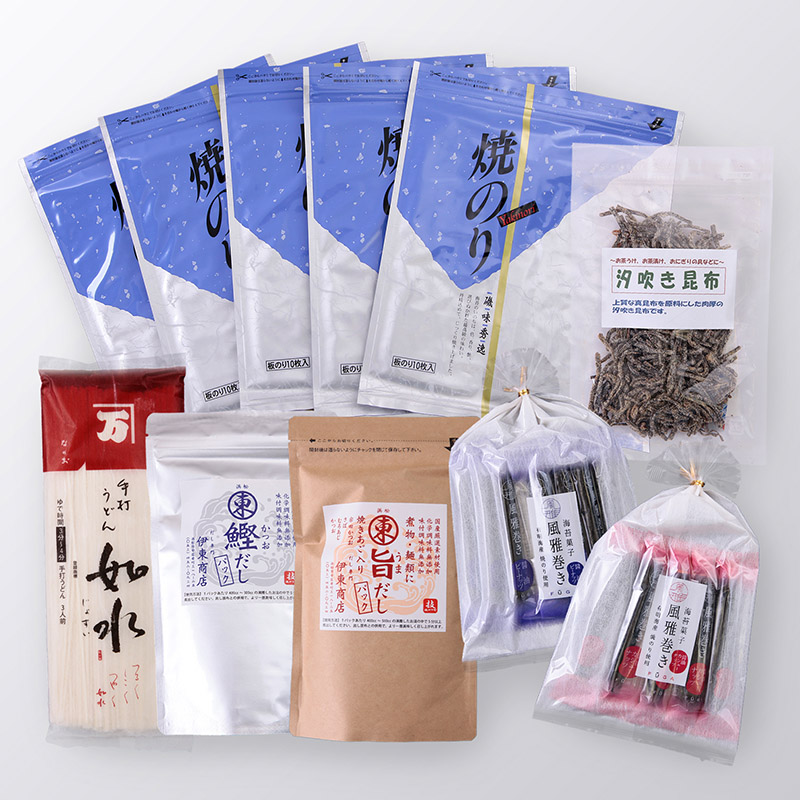 焼海苔(特上)10枚入り×3、鰹だしパック1個、旨だしパック1個、汐吹昆布100g入り1袋、手打ちうどん(乾麺)240g入り1袋、ごまふりかけ1袋、化粧箱入り4,500円(税込)